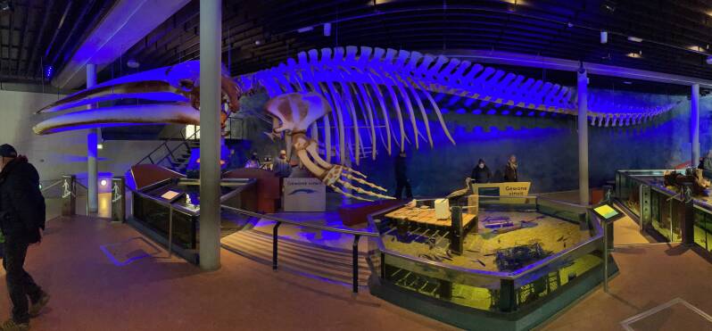 Het bijhorende museum van Ecomare; het 'zeemuseum' met daarin tal van vissoorten. Hieronder zie je het geraamte van een aangespoelde vinvis.
