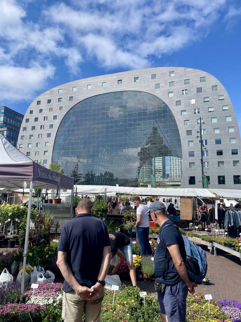 Dag 3, 12juli. Vandaag gaan we naar het iconische gebouw 'Markhal', waar ook op zaterdag in het gebouw en op het Binnenrotteplein een markt doorgaat van ruim 460 kramen. Er is ook nog een museumbezoek te doen en een boottocht op de Nieuwe Maas. Maar eerst de zaterdagse markt dus.