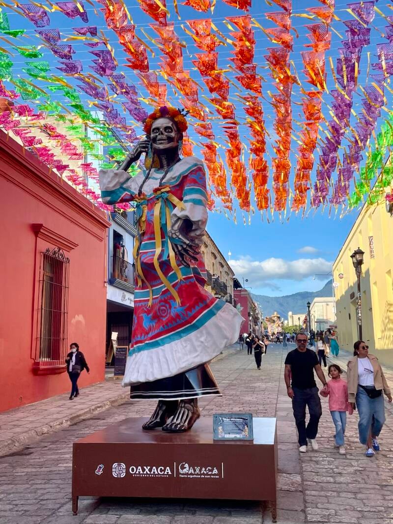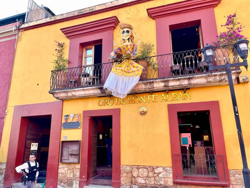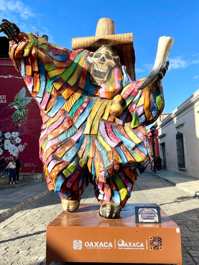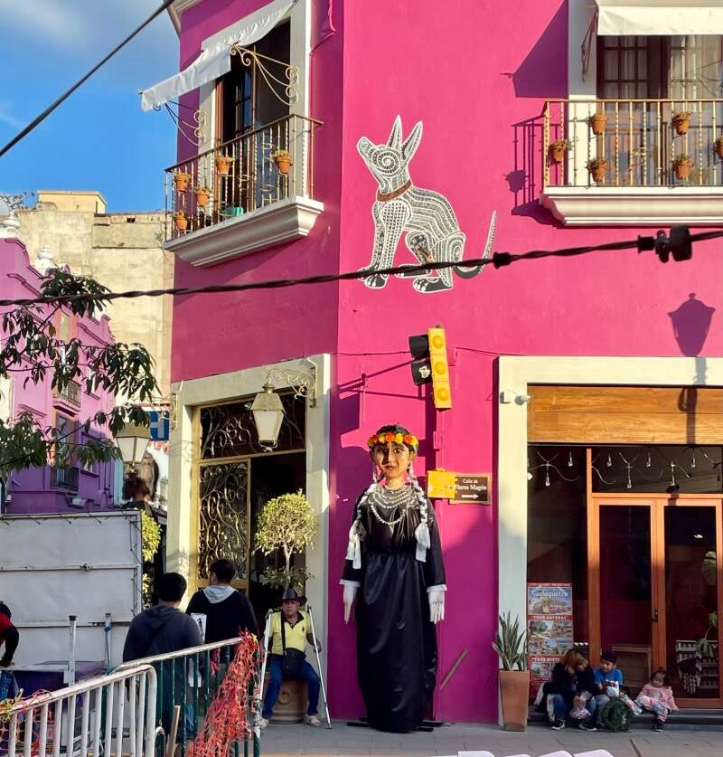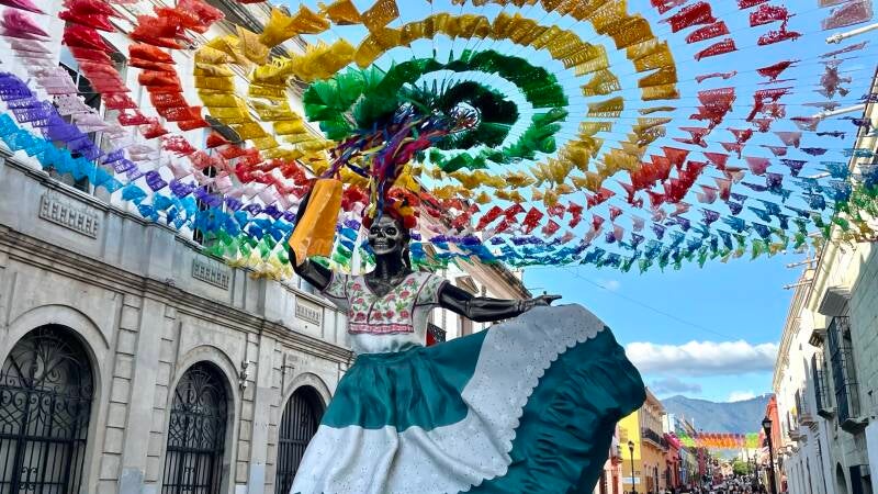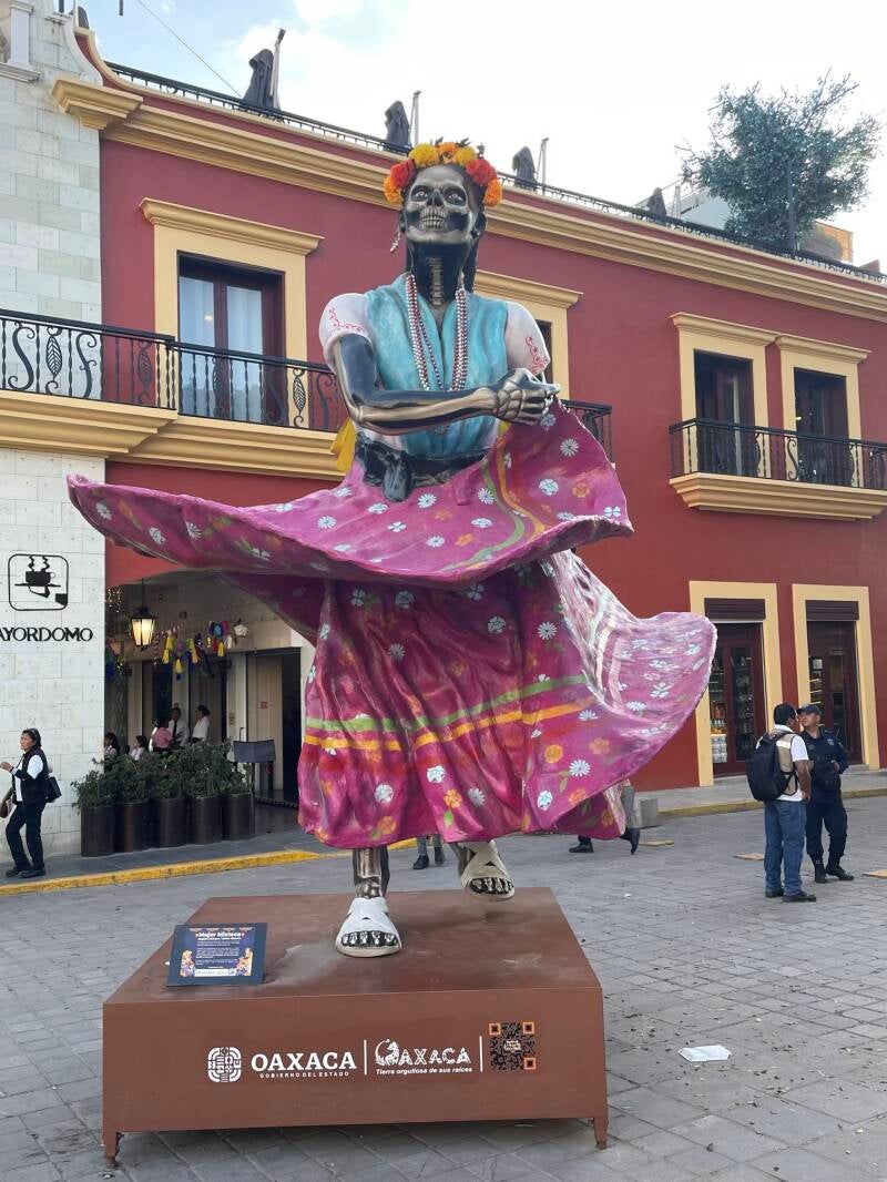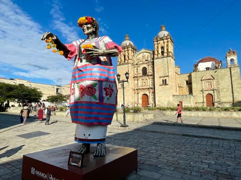 Onderweg hadden we te kampen met werkzaamheden op de snelweg vanwege neerstortende bomen bovenop de omliggende bergen. Oaxaca ( spreek uit Wachaka), is een mooie, kleurvolle, bruisende stad van zo’n 650.000 inwoners. Er zijn mooie kerken, pleinen en winkelstraten te zien. We trekken rond doorheen het historisch centrum. De grote poppen die nog opgesteld staan in de centrumstraten zijn nog van 1 november, het grootse herdenkingsfeest ter ere van de doden; Los dias de muertos.