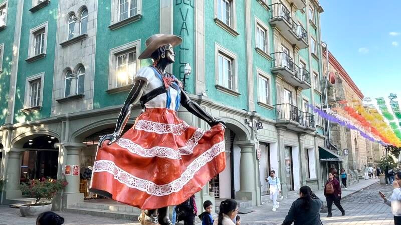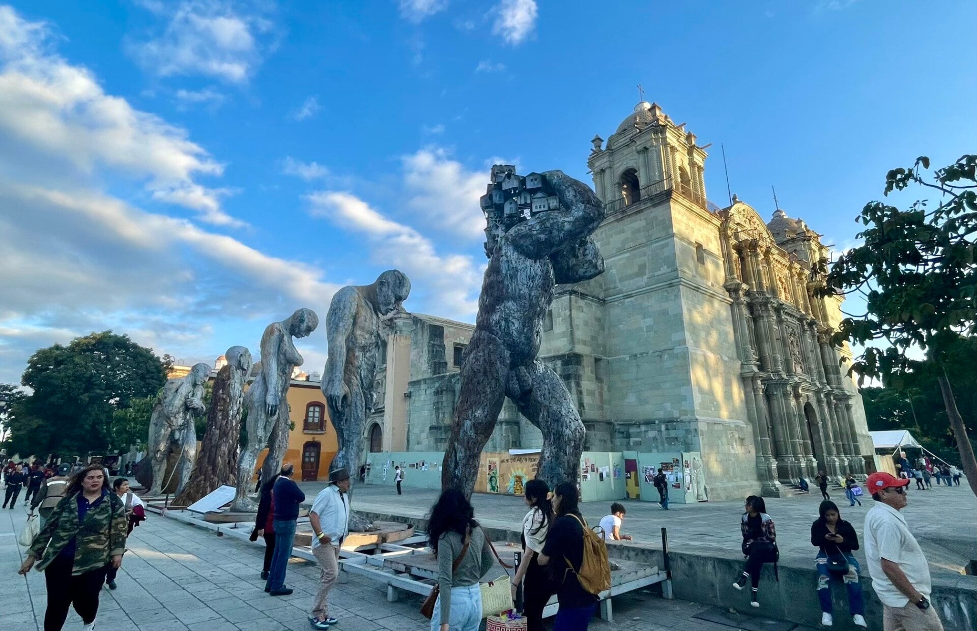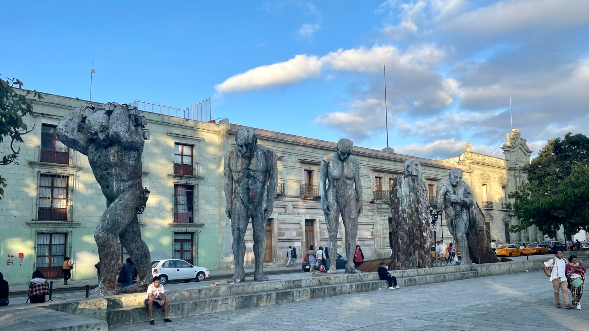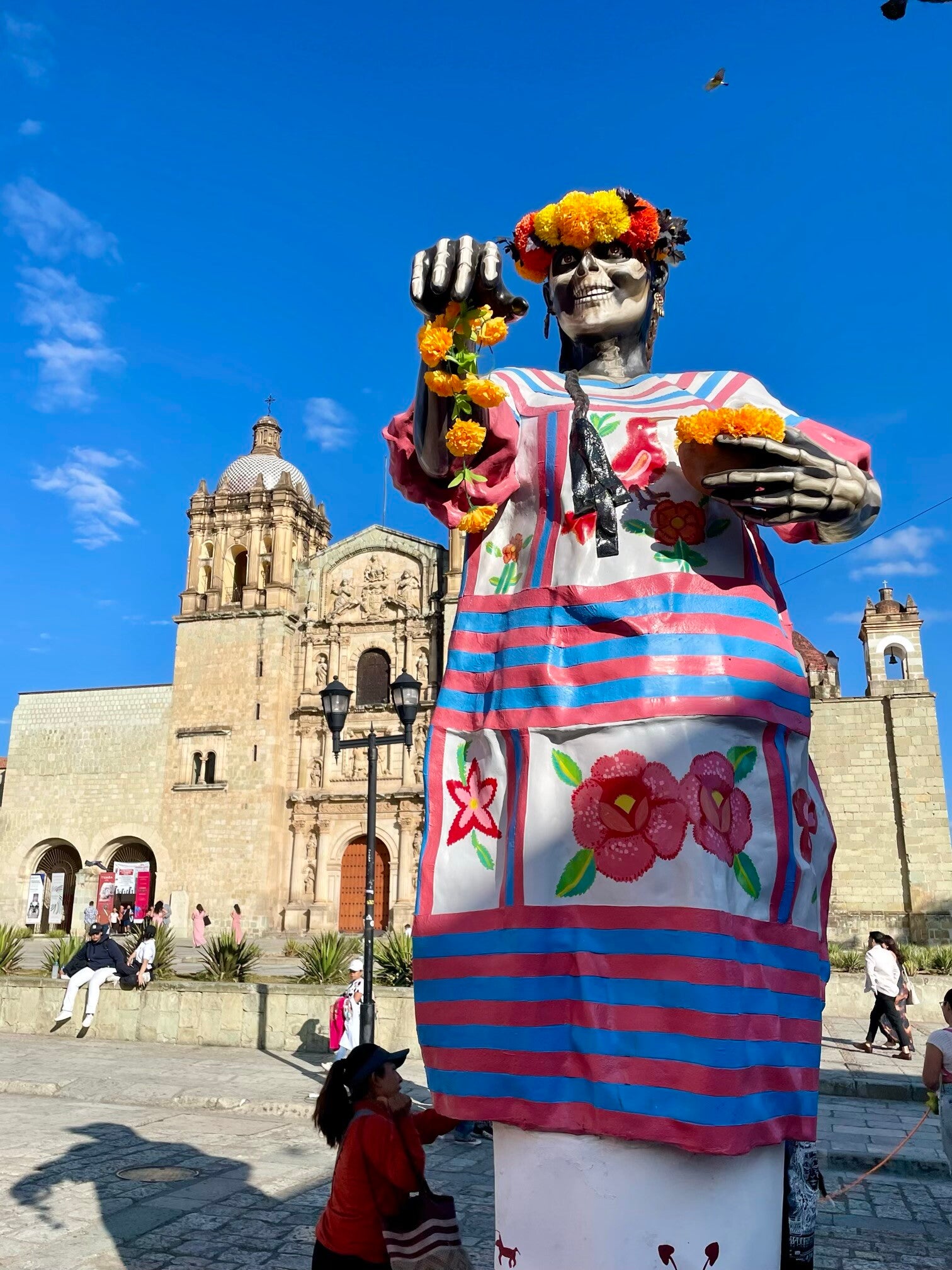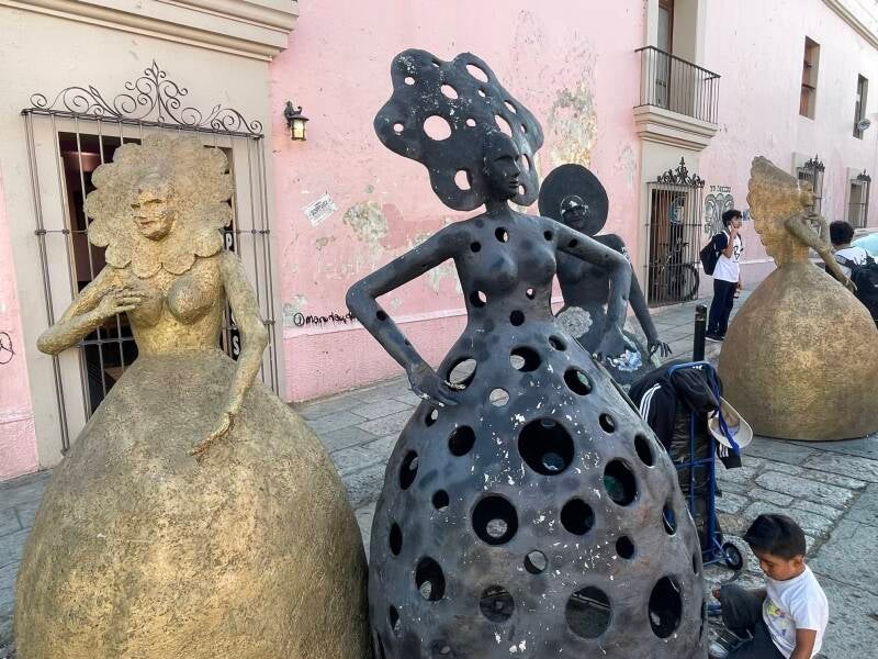 Onderweg hadden we te kampen met werkzaamheden op de snelweg vanwege neerstortende bomen bovenop de omliggende bergen. Oaxaca ( spreek uit Wachaka), is een mooie, kleurvolle, bruisende stad van zo’n 650.000 inwoners. Er zijn mooie kerken, pleinen en winkelstraten te zien. We trekken rond doorheen het historisch centrum. De grote poppen die nog opgesteld staan in de centrumstraten zijn nog van 1 november, het grootse herdenkingsfeest ter ere van de doden; Los dias de muertos.