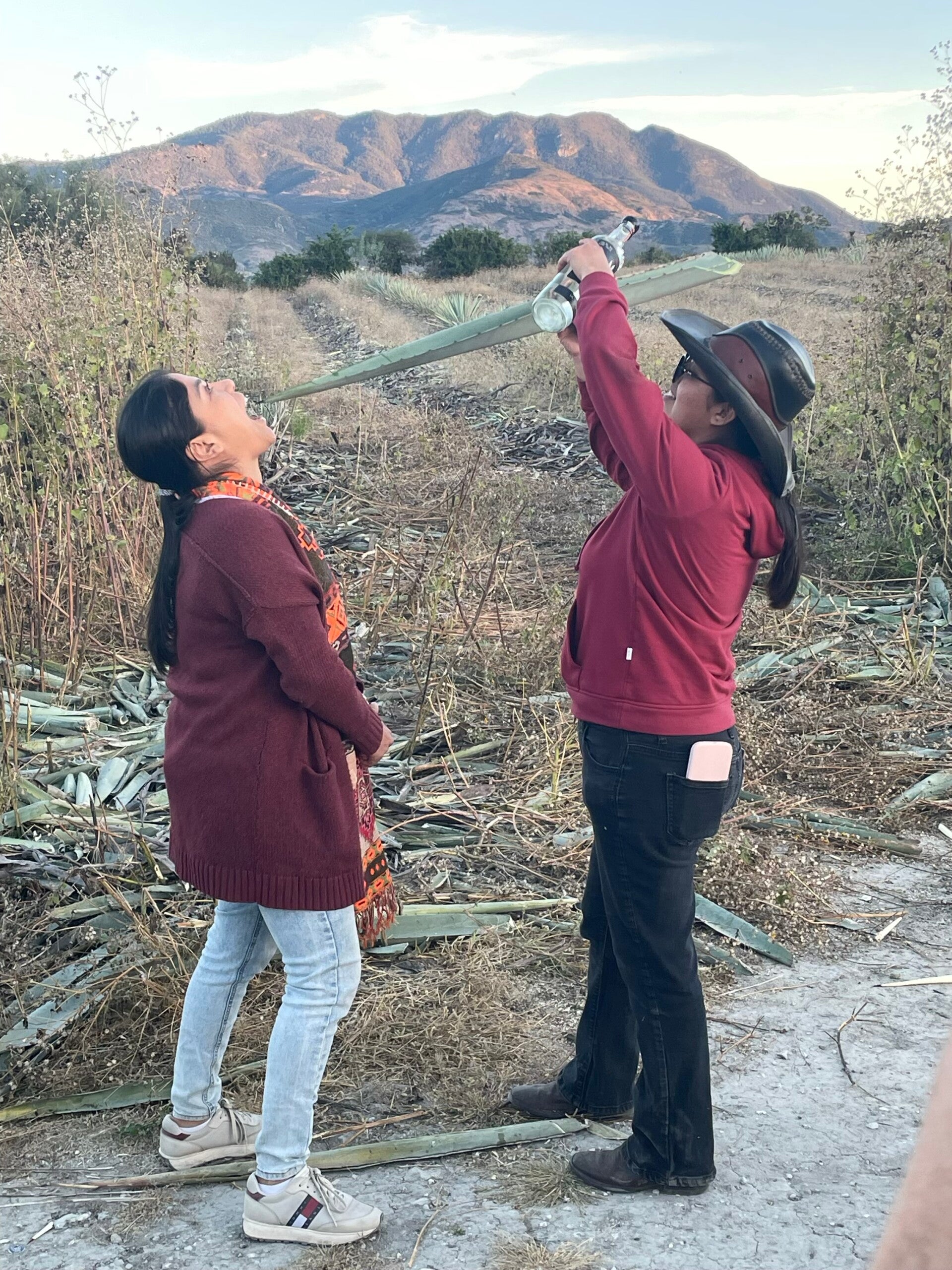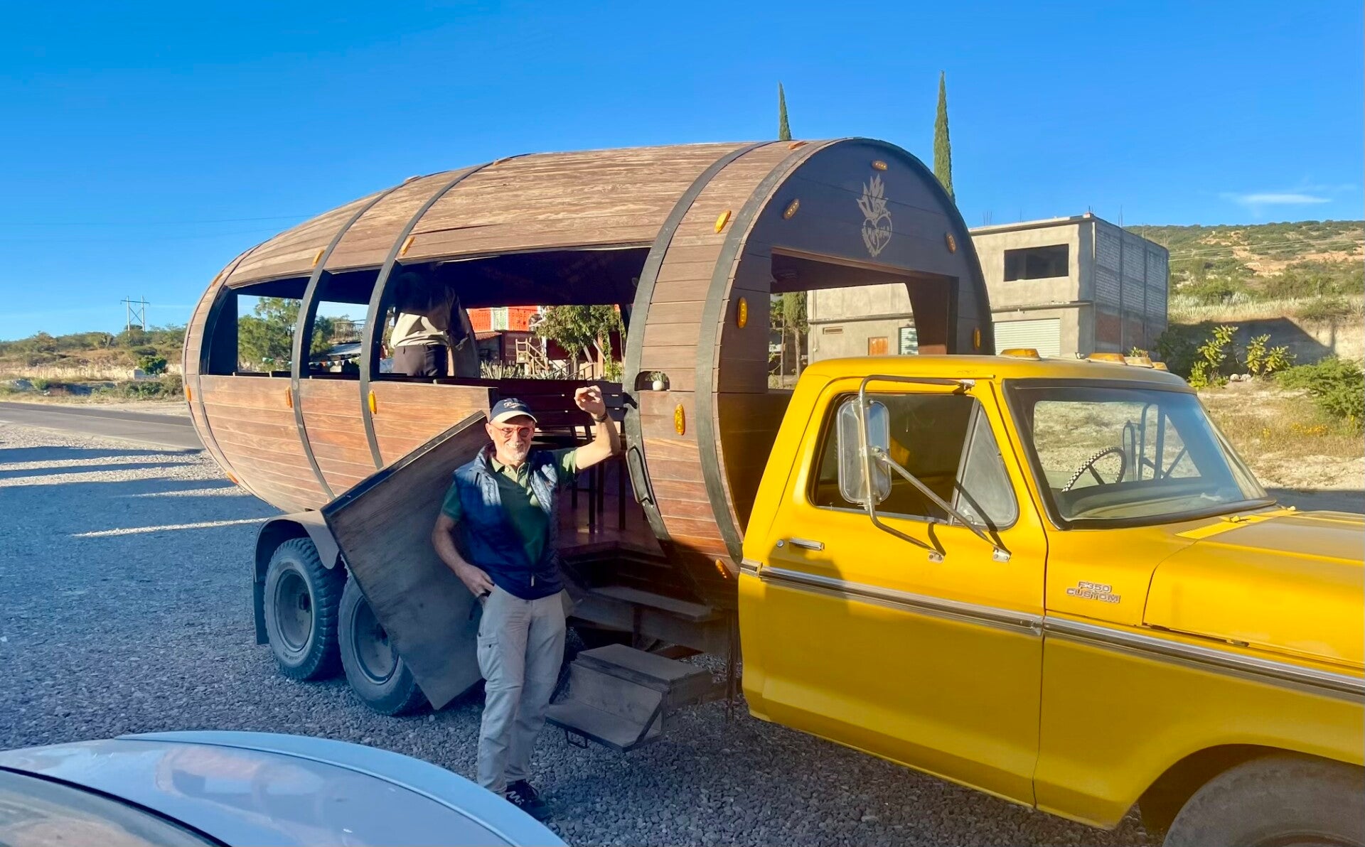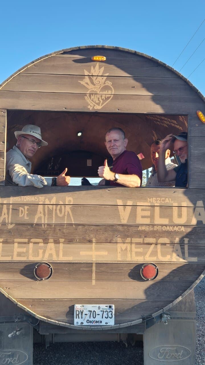 Onze dag werd afgesloten met een rondleiding in een plaatselijk ‘Mezcal’ distilleerderij. Na een bezoek aan de werkplaats mochten we even proeven en daarna volgt een rondrit met een camionnetje in de vorm van een ton met luide Spaanstalige muziek om de sfeer er in te houden.