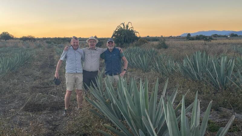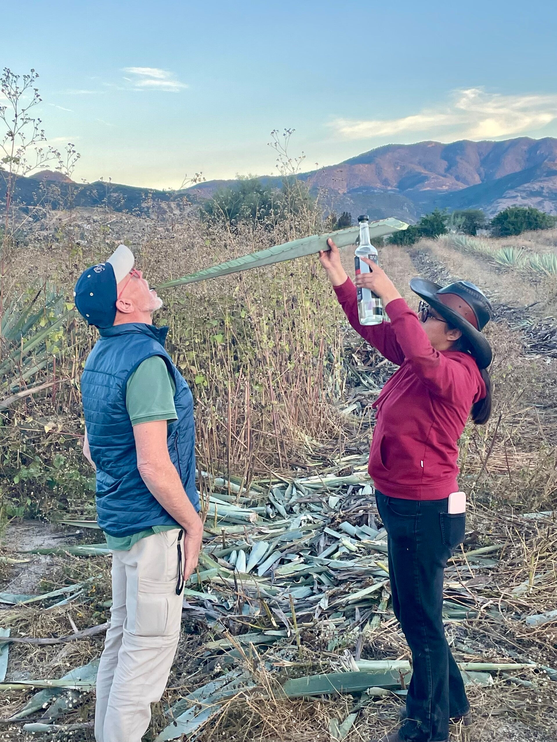 Op het veld tussen de agave planten waaruit de Mezcal vervaardigd wordt.